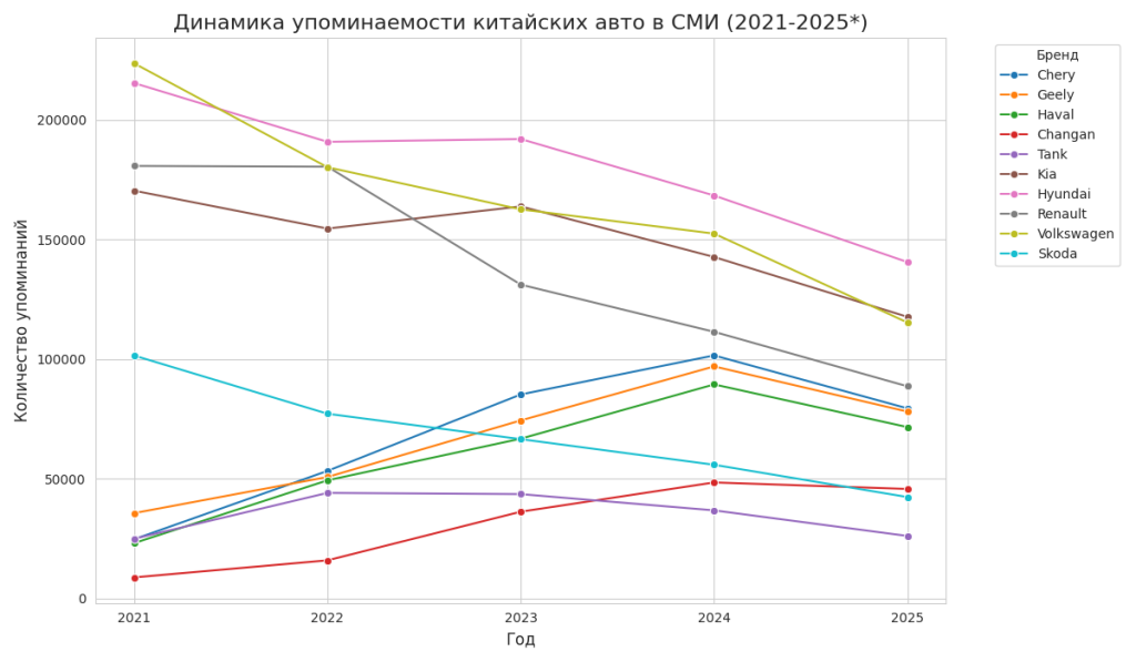 Changan демонстрирует самый впечатляющий относительный рост упоминаемости. С 2021 по сентябрь 2025 показатели упоминаемости бренда увеличились на 420%. Chery и Haval также показывают существенный рост упоминаемости, показатели увеличились на 221% и 210% соответственно. Geely также значительно вырос на рассматриваемом временном отрезке на 119%. Разница в темпах прироста обусловлена тем, что Changan позже других производителей начал активную экспансию на российском рынке.